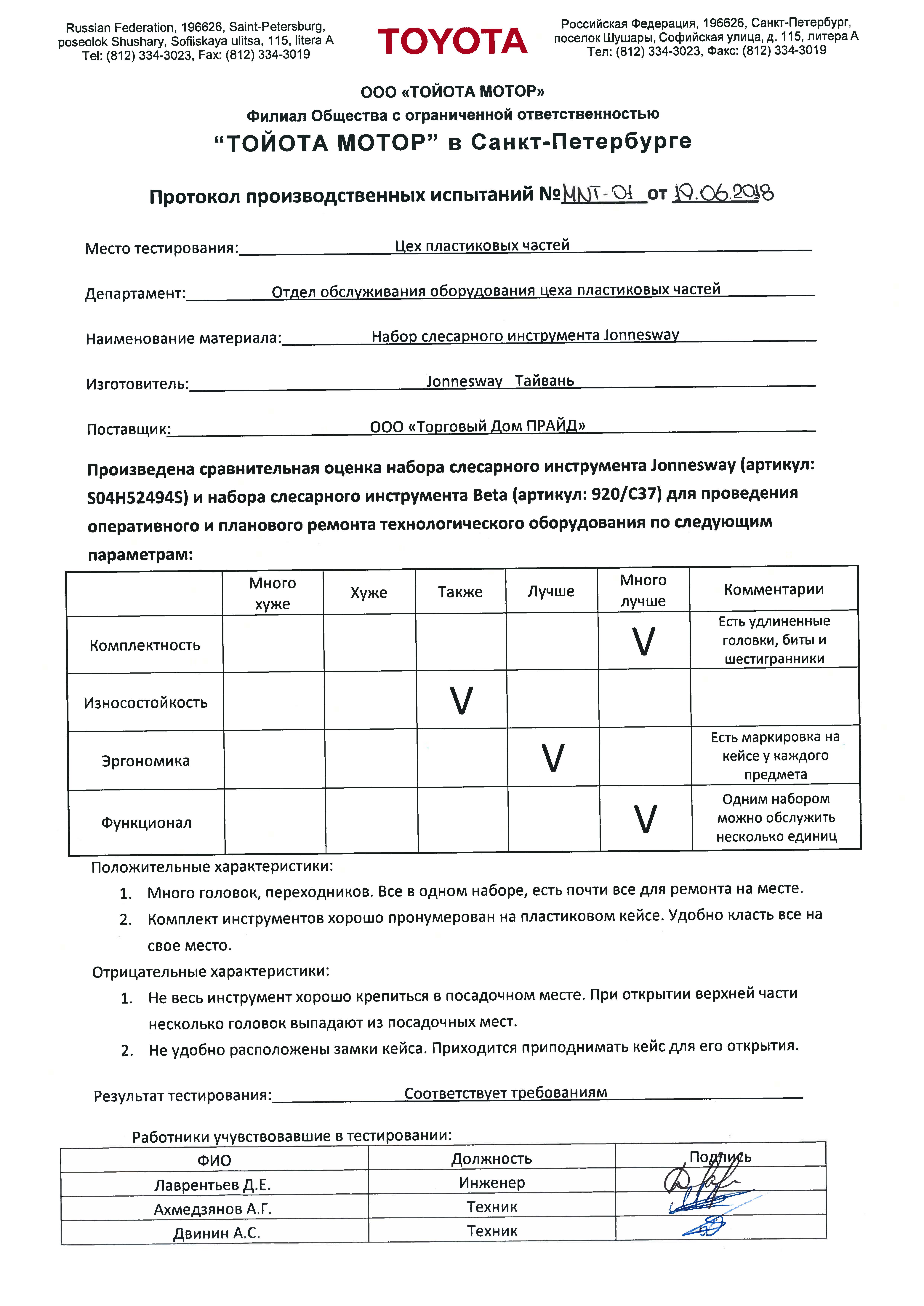 Протокол производственных испытаний "ТОЙОТА МОТОР" В Санкт-Петербурге