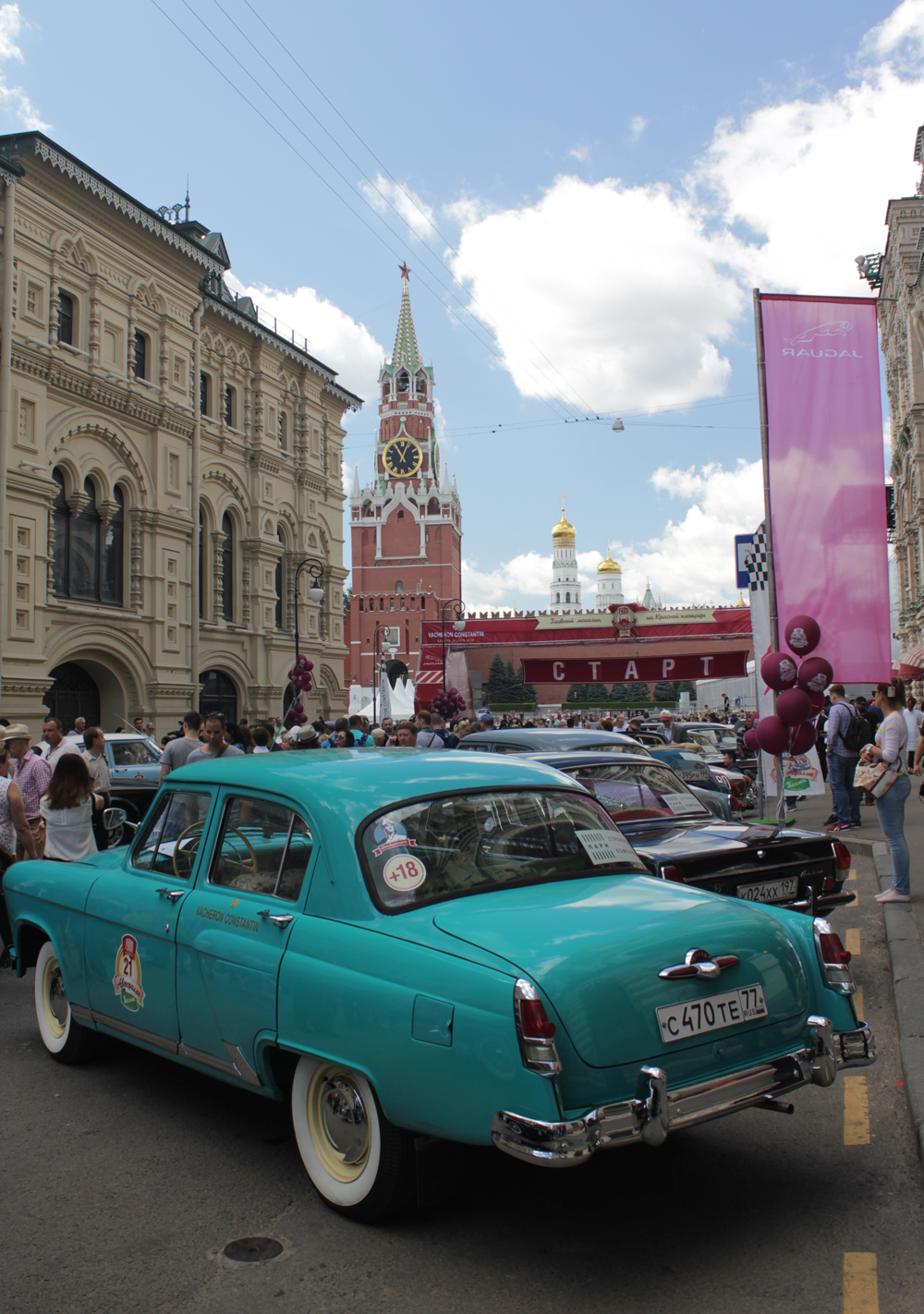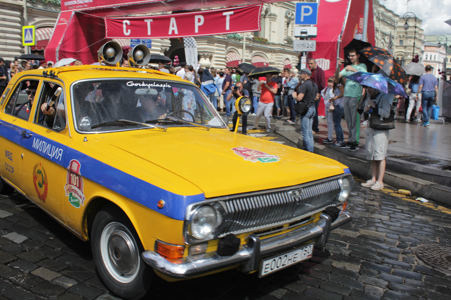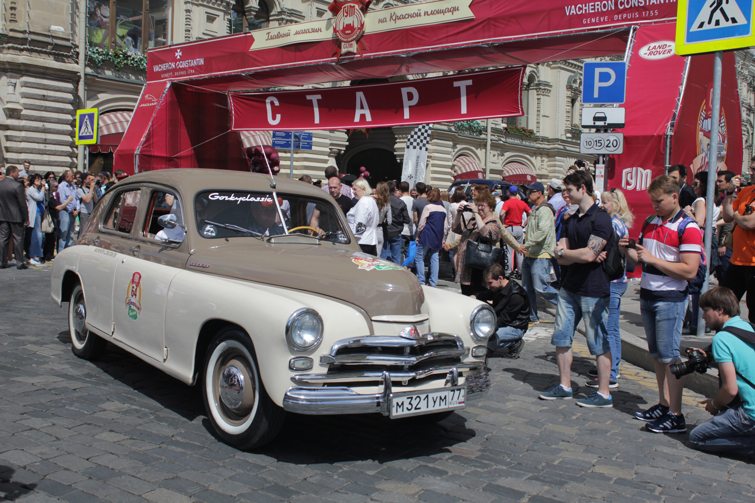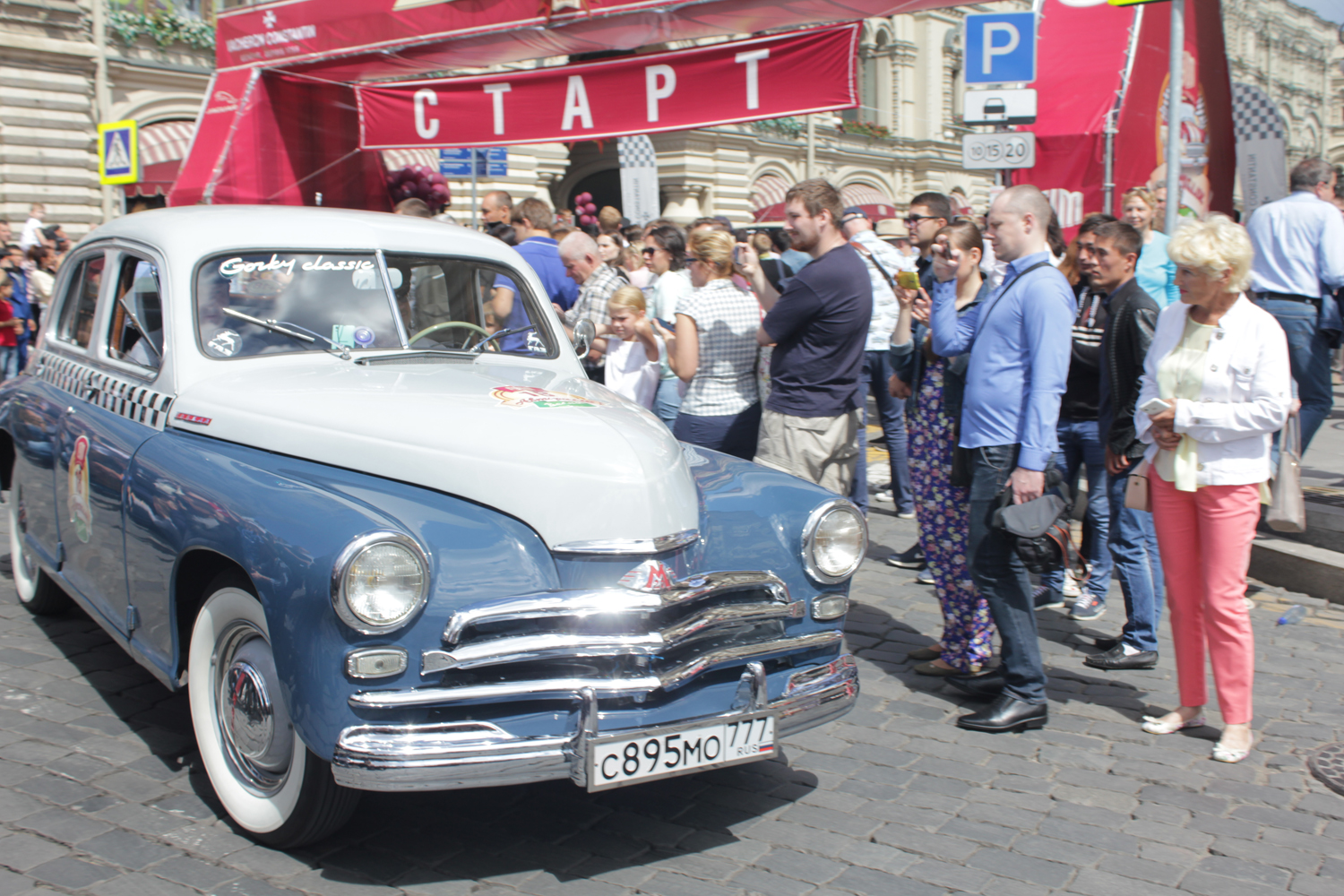 В воскресное утро, 23 июля, близ Красной площади можно было наблюдать колоритное зрелище: Ильинку и Ветошный переулок заполнили красивые, ухоженные автомобили и мотоциклы советского производства 1930-1970 года выпуска. Так уже 4-й год начинается ралли ГУМ. В этом году в мероприятии приняли участие 114 экипажей. И участники, и зрители как будто перенеслись на несколько десятилетий назад. Тут были и милицейская «канарейка», и бравые советские гаишники на «Волге» ГАЗ-24 (в последствии именно они победили в номинации «самый стильный экипаж»), и «Чайка» со свадебными кольцами на крыше, водителем которой выступил Михаил Куснирович.