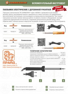 MZ0001A Паяльник электрический с деревянной рукояткой, паяльный стержень 6 мм, 60W, 220V-240V, T=400 C, код товара: 46367, артикул: MZ0001A