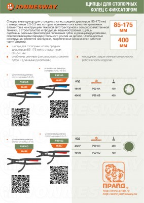 Специальные щипцы для стопорных колец средних диаметров (85-175 мм) с отверстиями 3.5-5.5 мм, которые применяются в качестве крепежных элементов в конструкциях тяжелой автотракторной и сельскохозяйственнойтехники, в строительстве и продукции машиностроения. Щипцы снабжены реечным фиксатором положения губок и длинными рукоятками, обеспечивающими передачу большого усилия на детали. Особенностью конструкции является накладные, закрепленные механически рабочие части изделий.