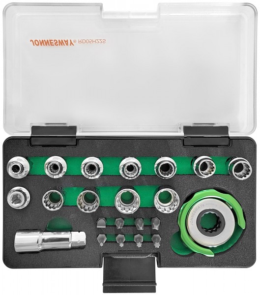 Набор Jonnesway RD05H22S в кейсе включающий в себя: торцевые головки ¼ дюйма Spline M4-M13 (12-ти гранная звездочка), дисковый трещоточный механизм и биты.