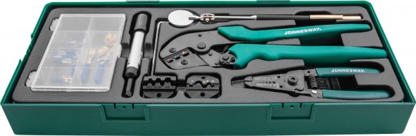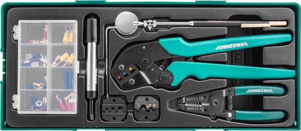 Пресс-клещи обжимные с аксессуарами и расходными материалами в ложементе 420х80 мм Jonnesway V1311SP используются для работы с электрическими соединениями и разъемами.