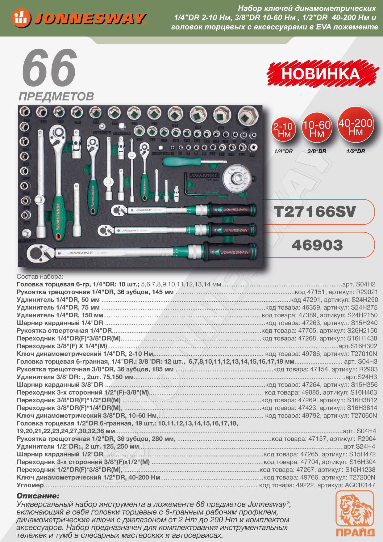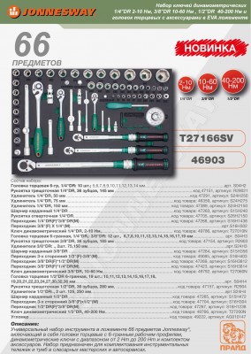 T27166SV Набор ключей динамометрических 1/4"DR 2-10 Нм, 3/8"DR 10-60 Нм , 1/2"DR 40-200 Hм и головок торцевых с аксессуарами в EVA ложементе, 66 предметов, код товара: 46903, артикул: T27166SV