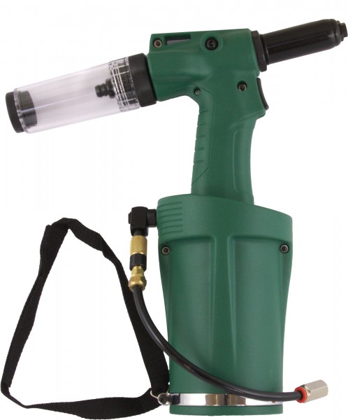 Заклепочник гидропневматический композитный, 4.8 - 6.4 мм. Изделие снабжено устройством вакуумного отбора и хранения отработанных хвостовиков заклепок. Инструмент изготовлен по технологиям, обеспечивающим малый вес изделия, что заметно снижает утомляемость оператора при работе.