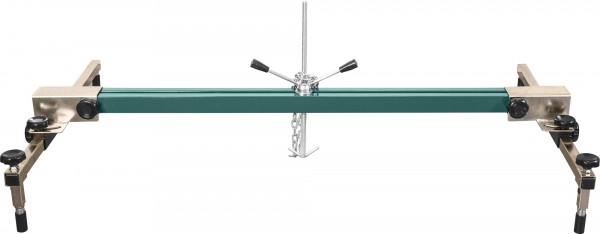 Универсальная опорная балка для двигателя и коробки передач. Универсальная четырехопорная балка применяется для вывешивания двигателя и его фиксации при производстве работ по его обслуживанию (замена опорных подушек двигателя) и работ с трансмиссией легковых автомобилей и легких коммерческих грузовиков капотной и полукапотной компоновки. Балка устанавливается на выступах моторного щита, имеет возможность установки на уклоне и с заужением подкапотного пространства благодаря возможности изменения угла установки опор, подвижности продольных опорных балок и большей опоры.