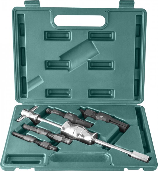 Съемник подшипников с удлиненными цанговыми захватами за внутреннюю обойму и обратным молотком в наборе, диапазон захватов 10-32 мм. Минимальный диапазон подвижности захватов съемника обязывает использовать инструмент строго в соответствии с указанным размерным диапазоном. В качестве части, передающей усилие на съемник, применяется «обратный молоток».