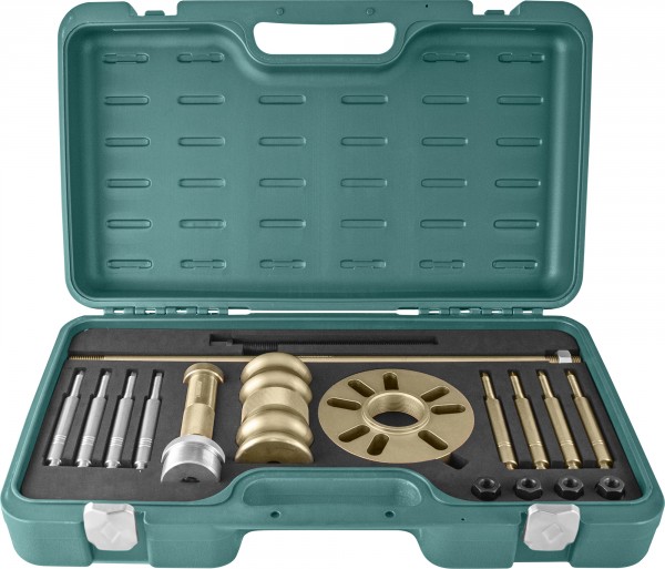Универсальный набор съемников ступиц легковых автомобилей, применяемый для производства работ по демонтажу ступиц, полуосей, приводных валов легковых автомобилей, имеющих 4 или 5 колесных крепежных деталей с PCD в диапазоне от 90 до 130 мм. В зависимости от выполняемой операции со съемником в качестве тянущего узла можно использовать ходовой винт или штангу с обратным молотком. Для удобства комплект хранится в оригинальном пластиковом кейсе.