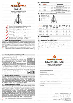 На инструменты и приспособления специального назначения торговой марки JONNESWAY® распространяется понятие «ограниченной гарантии», в связи с сокращением срока эксплуатации, связанным с повышенным износом некоторых деталей конструкции при использовании. Срок эксплуатации изделия с заявленными характеристиками определен в 12 месяцев с начала использования инструмента. Начало эксплуатации определяется по дате продажи, указанной в гарантийном талоне JONNESWAY® или фискальном документе, подтверждающем факт приобретения конкретного изделия. Срок применения инструмента с объявленными характеристиками может быть изменен индивидуально, как в сторону уменьшения, так и в сторону увеличения в зависимости от интенсивности и условий эксплуатации конкретного изделия (группы изделий).