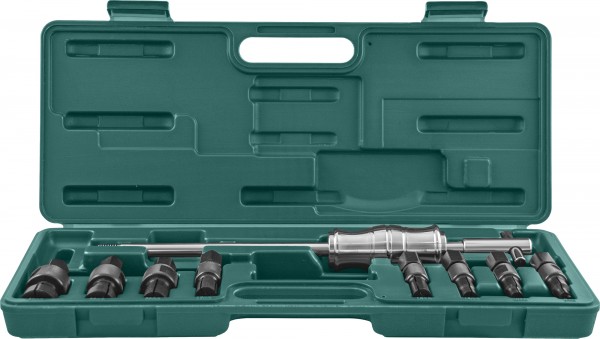 Съемник подшипников с цанговыми захватами за внутреннюю обойму и обратным молотком в наборе, диапазон захватов 8-30 мм. В качестве части, передающей усилие на съемник, применяется «обратный молоток».