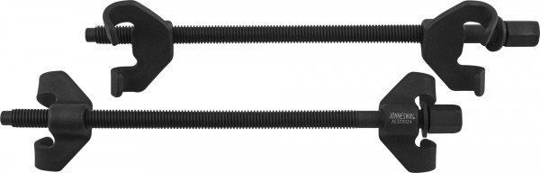 Стяжка пружин "усиленная" 370 мм. Плюсом стяжки являются компактные размеры, позволяющие использовать инструмент в ограниченном пространстве колесной арки, минусом – необходимость поочередной затяжки и отпуска ходовых винтов для предотвращения перекоса пружины. Изделие изготавливается из закаленной легированной хромомолибденовой стали, имеет защитное фосфатирование. При эксплуатации ограничено допускается применение механизированного инструмента.