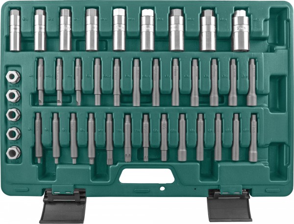Набор для демонтажа гаек штоков амортизаторов, стоек McPherson. Расширенный ассортимент инструментов, 83 предмета, содержащихся в наборе, позволяет обслуживать практически весь модельный ряд автомобилей, использующих в конструкции элементы подвески подобного типа. Торцевые головки имеют внешний шестигранный присоединительный профиль размером 22 мм, вставки-биты - 10 мм. Инструменты изготовлены из легированных сталей, обеспечивающих качественное исполнение работ. Для удобства комплект изделия хранится в оригинальном пластиковом кейсе.