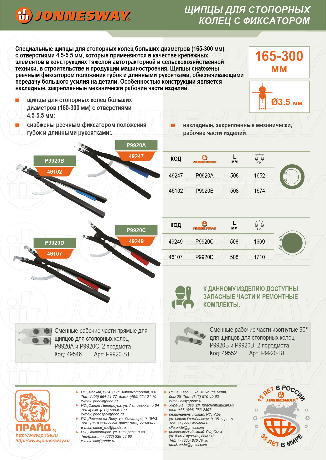 P9920A Щипцы прямые с фиксатором для стопорных колец, сжим, 165-300 мм, 4.5-5.5 мм, 500 мм, код товара: 49247, артикул: P9920A