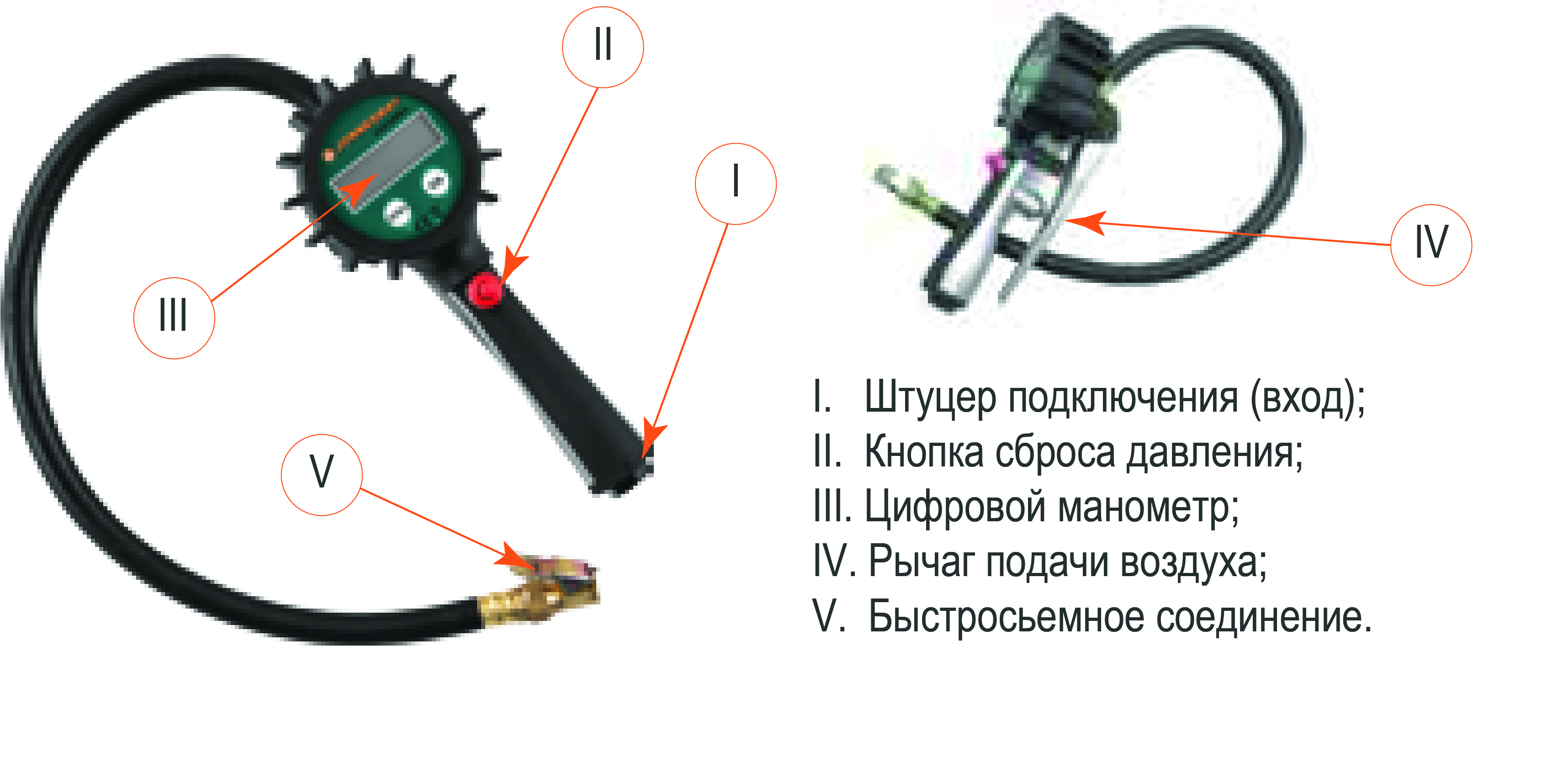 Включить прибор, нажав кнопку «ON» и настроить устройство (см. блок-схему настройки устройства). Подключить к пневматической линии через штуцер (I). Быстросъемное соединение (V) подключите к шине. Цифровой манометр (III) определит давление. Если давление в шине превышает норму, необходимо стравить его при помощи клапана сброса давления (II). Если давление в шине ниже нормы, нажать на рычаг подачи воздуха и отпусть его при достижении необходимого значения.