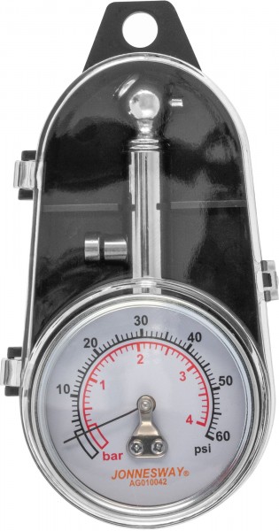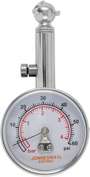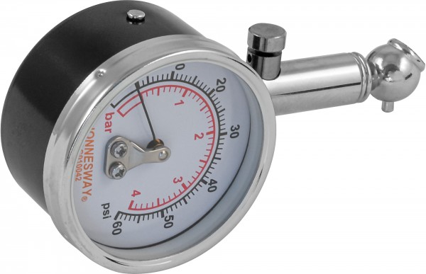 Манометр контроля давления пневматических шин транспортных средств с максимальным давлением в шинах до 4,2 кгс/см². Изделие имеет две дублирующие шкалы, которые номинированы в PSI (фунт-на-дюйм) и барах. Большинство автопроизводителей указывают контрольное давление, в том числе, и в этих единицах. В некоторый случаях достаточно разделить показание прибора на 14 и получить результат в кгс/см² (атм.). Поставляется в пластиковом корпусе.