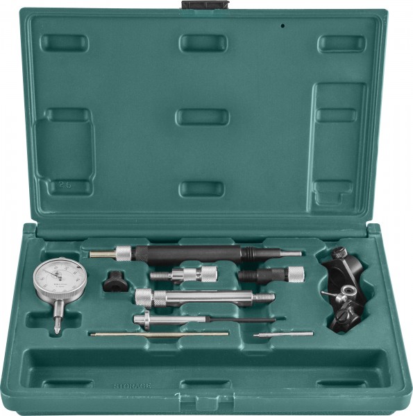 Приспособление для установки угла опережения зажигания ТНВД. В комплект поставки входят: набор адаптеров предназначенных для крепления стрелочного индикатора, сменные толкатели, установочный кронштейн и индикатор часового типа.