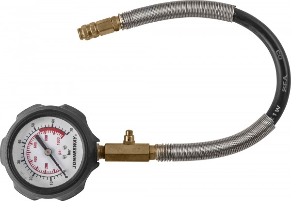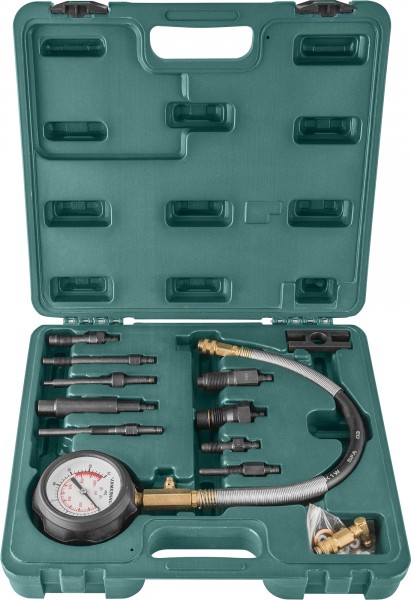 Компрессометр используется для контроля состояния деталей цилиндро-поршневой группы и ГРМ дизельных двигателей легковых автомобилей с прямым и непрямым системами впрыска. Подключение прибора осуществляется с помощью адаптеров через гнездо свечи накаливания. Изделие снабжено большим, 83 мм, аналоговым манометром в обрезиненном противоударном корпусе, шкала которого градуирована от 0 до 70 кгс/см² (0-1000 PSI). Соединительный армированный шланг, длиной 355 мм, снабжен быстросъемным соединением, рассчитан на пиковое давление 300 кгс/см².