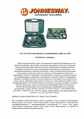 Тестер топливной системы Jonnesway. Большая гамма адаптеров позволяет производить измерения давления в топливной системе почти на всех автомобилях отечественного и импортного производства.