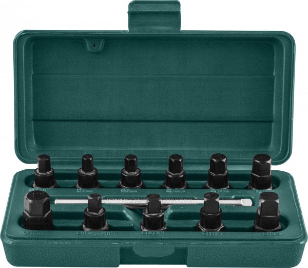 Комплект для откручивания масляных пробок, 12 предметов. При работе используется входящий в комплект поставки вороток или ключ, размером 19 мм.