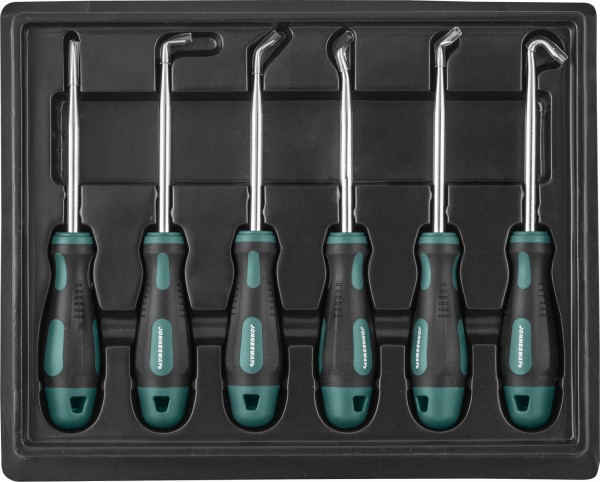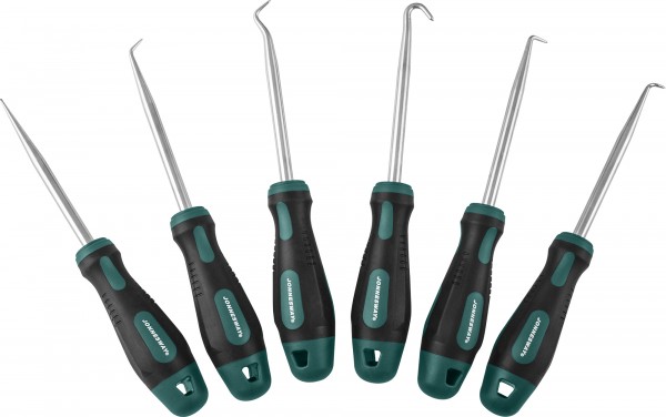 Набор крючков для демонтажа уплотнительных колец, 6 предметов. Инструменты изготовлены из хромованадиевой стали, имеют защитное хромоникелевое покрытие. Восьмимиллиметровое сечение прутка изделий обеспечивают возможность передачи серьёзных усилий. Рукоятки изделий выполнены из термопластического эластомера, устойчивого к органическим растворителям и кислотам.