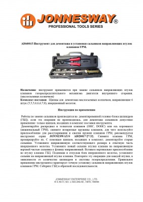 Инструменты и приспособления специального назначения производства компании JONNESWAY® ENTERPRISE CO., LTD., по уровню исполнения относятся к изделиям класса PROFESSIONAL, применяется для производства работ по сборке, ремонту и обслуживания продукции машиностроения, строго персоналом, имеющим соответствующую квалификацию, знакомым с правилами техники безопасности, условиями эксплуатации и навыками работы со специальным инструментом и приспособлениями.