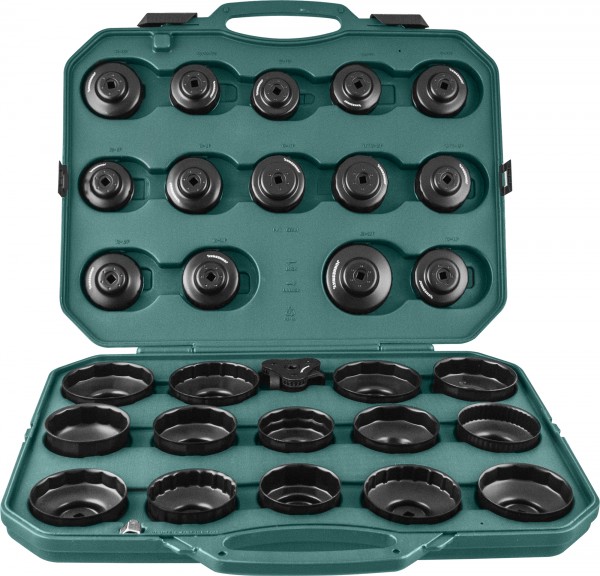 Комплект чашек для съема масляных фильтров 65-120 мм, 30 предметов. Все инструменты изготовлены из штампованной стали и снабжены присоединительным гнездом, позволяющим использовать штатные слесарные приводы с размером квадрата 3/8”DRили, в сочетании с входящим в комплект поставки адаптером, 1/2"DR.
