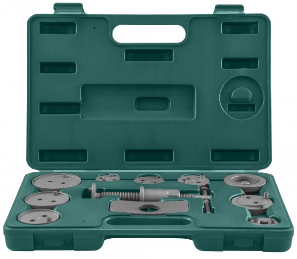 Набор для возврата поршней дисковых тормозных механизмов применяется при ремонте и обслуживании суппортов дисковых тормозов легковых автомобилей таких марок, как: Audi, BMW, MB, Toyota, Ford, Honda, Nissan, Mitsubishi, GM и подобных, в том числе таких, у которых устройство тормозных механизмов подразумевает воздействие путем совмещения двух усилий, вращательного, перпендикулярно оси вращения поршня и осевого, для возврата в исходное положение поршня рабочего цилиндра тормозного суппорта. Наличие большого количества насадок обусловлено разнообразием форм днищ поршней тормозных цилиндров у разных производителей.