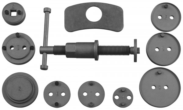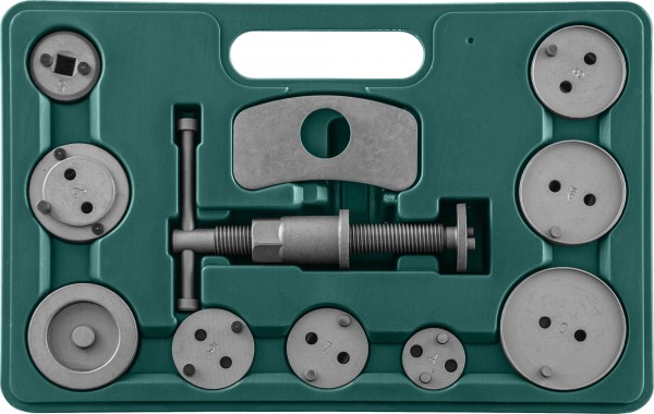 Комплект инструмента для развода поршней тормозных цилиндров из 11 предметов. Наличие большого количества насадок обусловлено разнообразием форм днищ поршней тормозных цилиндров у разных производителей.