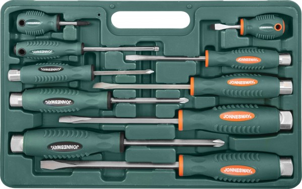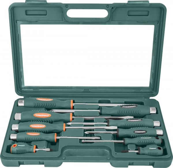 Набор отверток стержневых ударных, силовых под ключ и магнитной рукояткой, 10 предметов Jonnesway. Стержневые отвертки серии "D70" со сквозной установкой стержня из хромомолибденованадиевой стали, намагниченным наконечником и затыльником рукоятки, выдерживающим воздействие удара, ограниченно превращающего отвертку в подобие кернера или выколотки. На затыльнике сформированы грани для применения рожкового ключа, увеличивающего крутящий момент при воздействии на резьбовой крепежный элемент. Современные материалы основы рукоятки обеспечивают снижение вибраций и реактивных моментов при ударной нагрузке, а сантопреновый, устойчивый к скольжению, верхний контактный слой - надежное удержание инструмента в руке.