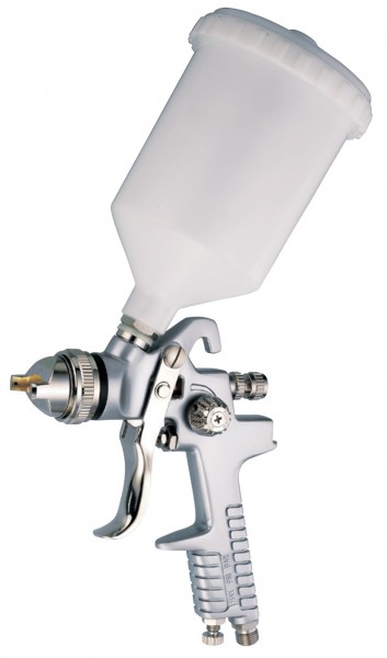 Пневматический покрасочный пистолет компактного размера, конвенционального типа и гравитационной подачей ЛКМ с верхним расположением бачка. Применяется для производства малярных работ всеми типами материалов при обработке малых поверхностей и работ в труднодоступных местах.