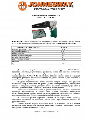 Пневматический механизированный инструмент JONNESWAY® ENTERPRISE CO., LTD., по уровню исполнения относятся к изделиям класса PROFESSIONAL, применяется для производства работ по сборке, ремонту и обслуживания продукции машиностроения, персоналом, имеющим соответствующую квалификацию, знакомым с правилами техники безопасности, условиями эксплуатации и навыками работы. Изделия применяются для производства работ по сборке, ремонту и обслуживания продукции машиностроения, персоналом, имеющим соответствующую квалификацию, знакомым с правилами техники безопасности, условиями эксплуатации и навыками работы с механизированным инструментом.