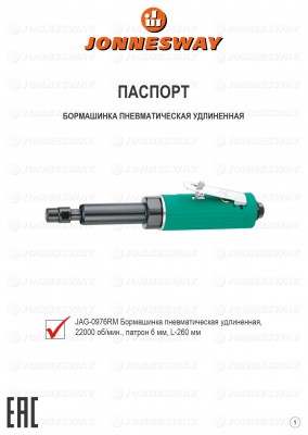 JAG-0976RM Бормашинка пневматическая удлиненная 22000 об/мин., патрон 6 мм, L-260 мм, код товара: 48528, артикул: JAG-0976RM