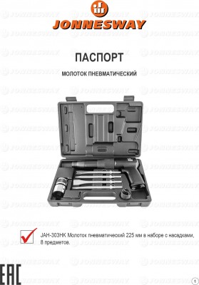 Пневматический молоток JAH-303 – инструмент, оборудованный механизмом возвратно-поступательного действия, обладающий высокой энергией и частотой ударов. Изделие имеет пониженный расход воздуха, снабжено устройством, гасящим вибрацию при работе, гибким соединением для подключения воздушного шланга, комплектуется быстросъемным патроном и набором насадок. При проведении работ с использованием этого инструмента необходимо защищать руки, с помощью перчаток, гасящих вибрацию, применять средства защиты органов зрения, дыхания и слуха.