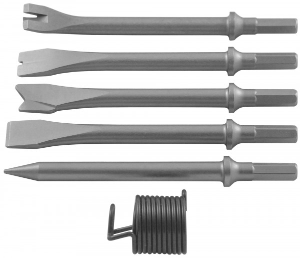 Набор молоток пневматический 2100 уд/мин., патрон H10, с насадками, 8 предметов. Набор, содержащий, помимо собственно пневматического молотка JAH-6833H, пять наиболее распространенных насадок для производства работ по резке, рубке, разрушению и т.п. металов и материалов различной твердости и пластичности. При проведении работ с использованием этого инструмента необходимо защищать руки, с помощью перчаток, гасящих вибрацию, применять средства защиты органов зрения, дыхания и слуха.