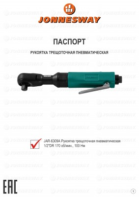 JAR-6309A Рукоятка трещоточная пневматическая 1/2"DR 170 об/мин., 100 Нм, код товара: 47111, артикул: JAR-6309A