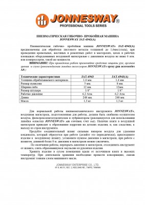 На пневматический механизированный инструмент торговой марки JONNESWAY® распространяется понятие «ограниченной гарантии», в связи с сокращением срока эксплуатации, связанным с повышенным износом некоторых деталей конструкции при использовании. Срок эксплуатации изделия с заявленными характеристиками определен в 12 месяцев с начала использования инструмента. Начало эксплуатации определяется по дате продажи, указанной в гарантийном талоне JONNESWAY® или фискальном документе, подтверждающем факт приобретения конкретного изделия. Срок применения инструмента с объявленными характеристиками может быть изменен индивидуально, как в сторону уменьшения, так и в сторону увеличения в зависимости от интенсивности и условий эксплуатации конкретного изделия (группы изделий).