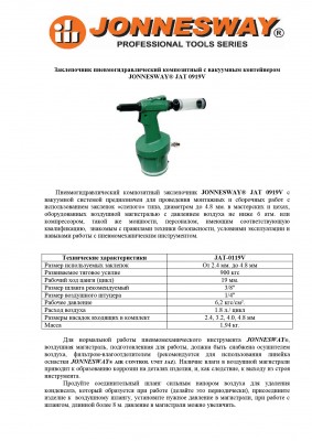 Пневмогидравлический композитный заклепочник Jonnesway Jat 0919V с вакуумной системой предназначен для проведения монтажных и сборочных работ с использованием заклепок «слепого» типа, диаметром до 4.8 мм. в мастерских и цехах, оборудованных воздушной магистралью с давлением воздуха не ниже 6 атм. или компрессором, такой же мощности, персоналом, имеющим соответствующую квалификацию, знакомым с правилами техники безопасности, условиями эксплуатации и навыками работы с пневмомеханическим инструментом.