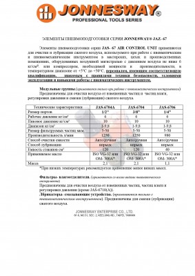 Элементы пневмоподготовки серии JAS-67 Air Control Unit применяются для очистки и лубрикации сжатого воздуха, используемого при работе с пневматическим и пневмомеханическим инструментом в мастерских, цехах и производственных помещениях, оборудованных воздушной магистралью с давлением воздуха не ниже 6 кг/см². или компрессором, необходимой мощности и производительности, в температурном диапазоне от +5°С до +50°С, персоналом, имеющим соответствующую квалификацию, знакомым с правилами техники безопасности, условиями эксплуатации и навыками работы с пневматическим инструментом.
