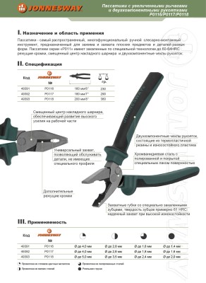 Шарнирно-губцевые инструменты JONNESWAY® ENTERPRISECO., LTD., по уровню исполнения относятся к изделиям класса PROFESSIONAL, применяются для производства работ по сборке, ремонту и обслуживания продукции машиностроения, персоналом, имеющим соответствующую квалификацию, знакомым с правилами техники безопасности, условиями эксплуатации и навыками работы.