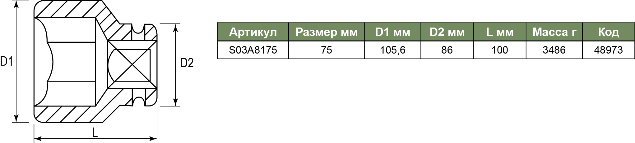 S03A8175 Головка торцевая ударная 1"DR, 75 мм, код товара: 48973, артикул: S03A8175