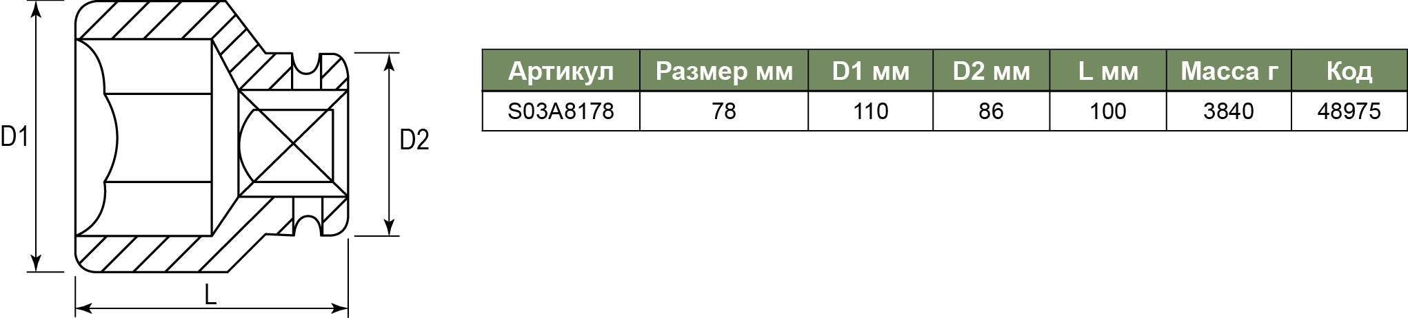 S03A8178 Головка торцевая ударная 1"DR, 78 мм, код товара: 48975, артикул: S03A8178