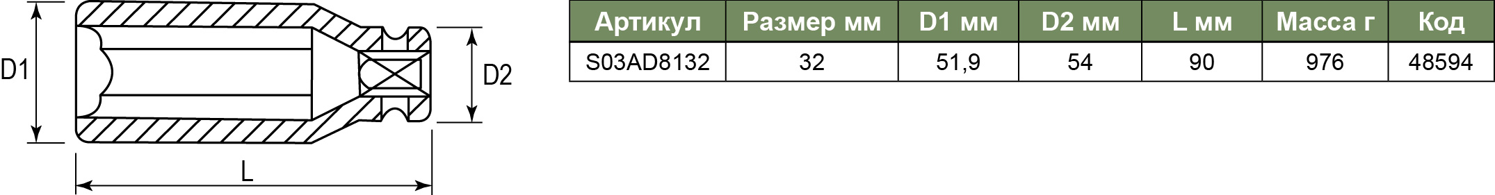 S03AD8132 Головка торцевая ударная глубокая 1"DR, 32 мм, код товара: 48594, артикул: S03AD8132