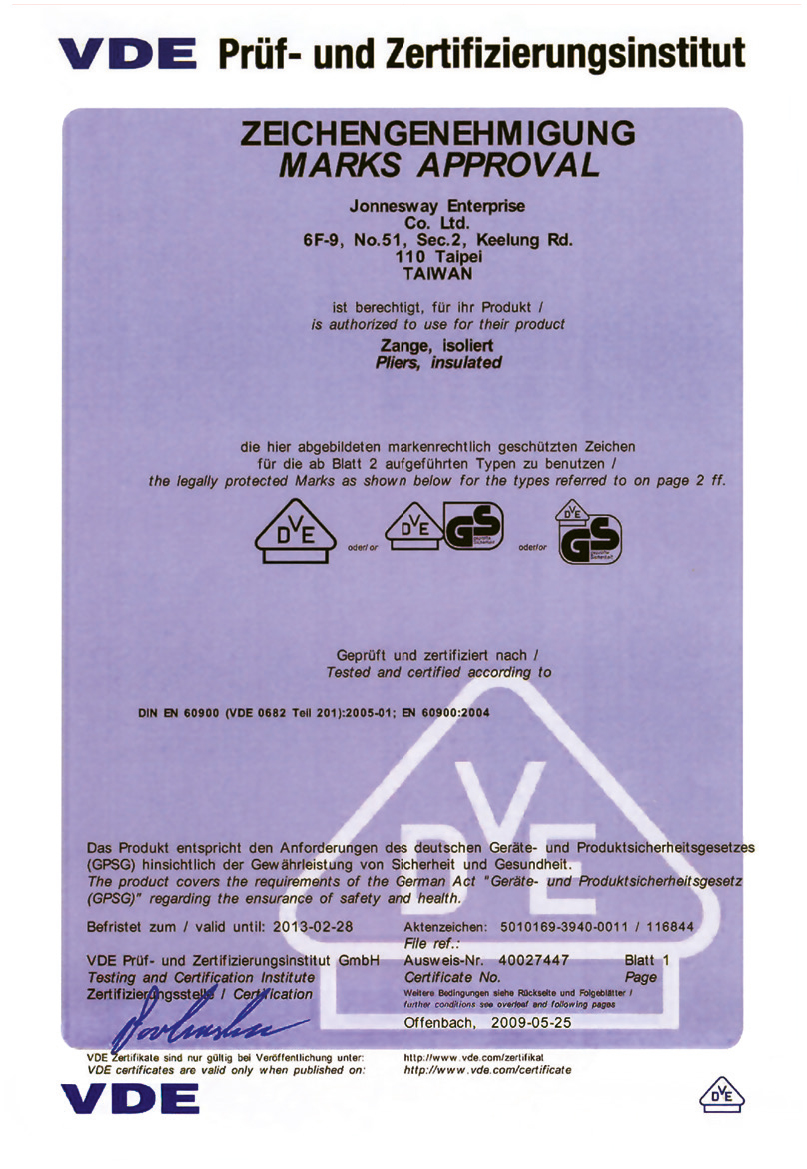 Сертификат, выданный Ассоциацией электротехники, электроники и информационных технологий, предоставляющий право наносить маркировку VDE на диэлектрический шарнирно-губцевый инструмент JONNESWAY®. Знак VDE, присутствующий на рукоятке изделия, считается символом самых высоких стандартов безопасности.