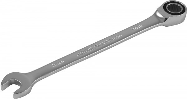 Гаечный комбинированный ключ представляет собой конструкцию, объединяющую рожковый профиль и накидной профиль с рабочей частью со встроенным храповым механизмом. Сочетание двух одноразмерных профилей компенсируют недостатки каждого в отдельности. Храповой механизм с колесом в 72 зуба обеспечивает высокий передаваемый крутящий момент благодаря применяемой хромованадиевой стали, закаленной особым способом. Малый, 5°, обратный ход делает ключ незаменимым в ограниченном рабочем пространстве.