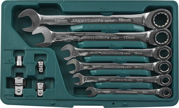 W45110S Набор ключей гаечных комбинированных трещоточных с аксессуарами в кейсе, 8-19 мм, 10 предметов, код товара: 48879, артикул: W45110S