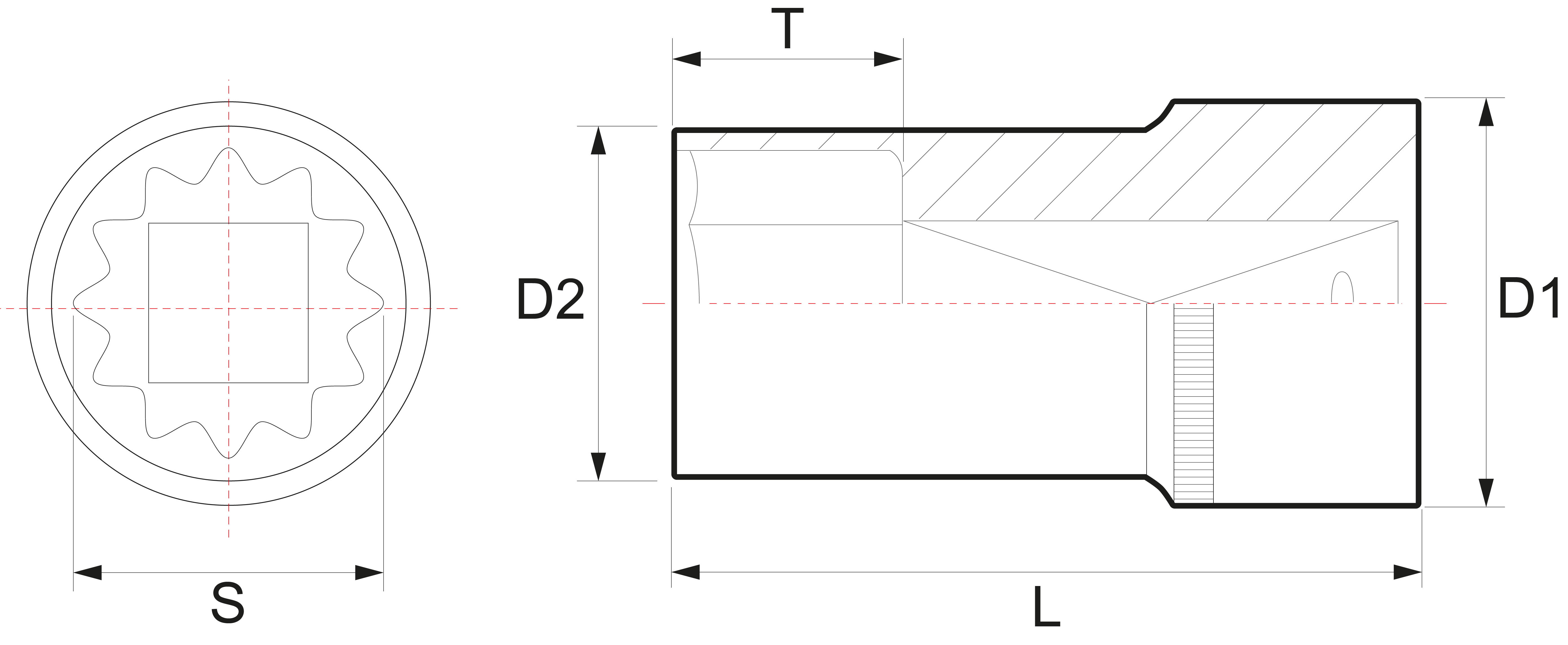 Двенадцатигранная торцевая головка увеличенной длины. Применяется при работе с крепежом на относительно высоких шпильках и заглубленных деталях. Двенадцатигранные головки удобнее в применении по сравнению с 6-гранным, так как какой профиль предоставляет большую свободу для позиционирования головки на крепеже. Однако, он обладает меньшим по площади пятном контакта и воздействие на крепеж, особенно с высокой нагрузкой, может повредить грани крепежной детали, что в сочетании с большим количеством концентраторов напряжения несколько ограничивает применяемые максимально допустимые нагрузки, опять же, по сравнению с 6-гранными головками.