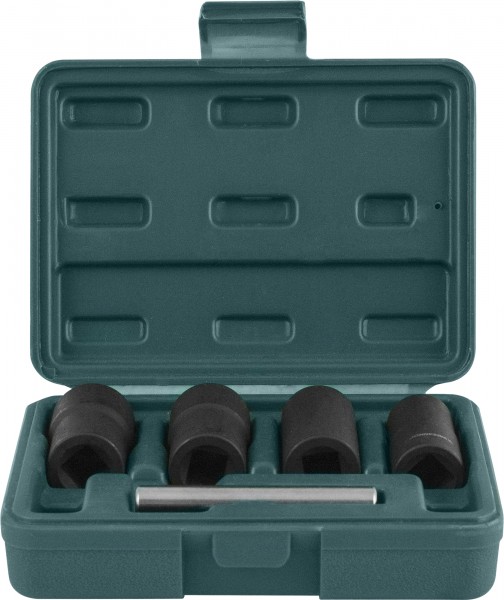 Спиральные головки для демонтажа поврежденного крепежа в наборе, 17, 19, 21, 22 мм, 5 предметов. Изделия выпускаются увеличенной длины для обслуживания, в том числе, заглубленного крепежа. Для удобства, детали, входящие в состав набора, хранятся в оригинальном пластиковом кейсе.