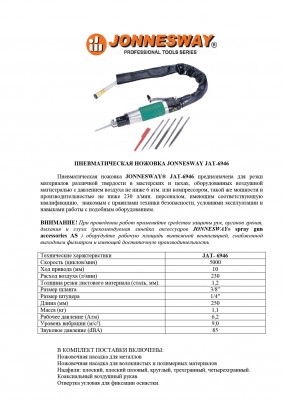 Пневматическая ножовка Jonnesway JAT-6946 предназначена для резки материалов различной твердости в мастерских и цехах, оборудованных воздушной магистралью с давлением воздуха не ниже 6 атм. или компрессором, такой же мощности и производительностью не ниже 230 л/мин. персоналом, имеющим соответствующую квалификацию, знакомым с правилами техники безопасности, условиями эксплуатации и навыками работы с подобным оборудованием.