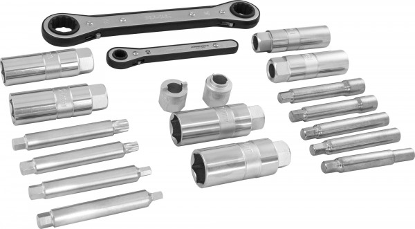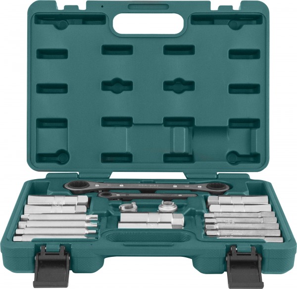 Набор приспособлений для демонтажа гаек штоков амортизаторов. Ассортимент инструментов, 22 предмета, содержащихся в наборе, позволяет обслуживать ряд популярных автомобилей, использующих в конструкции элементы подвески подобного типа. Торцевые головки имеют внешний шестигранный присоединительный профиль размером 22 мм, вставки-биты - 10 мм. Инструменты изготовлены из легированных сталей, обеспечивающих качественное исполнение работ. Для удобства комплект изделия хранится в оригинальном пластиковом кейсе.