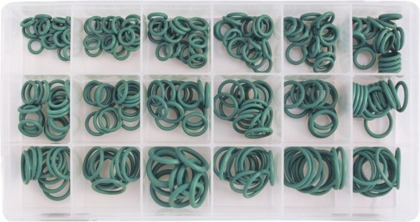 Набор специальных уплотнительных колец, 270 шт, применяющихся в качестве расходных материалов при производстве работ по ремонту и обслуживанию систем кондиционирования автомобилей, использующих хладагенты марок R-12 и R-134A.