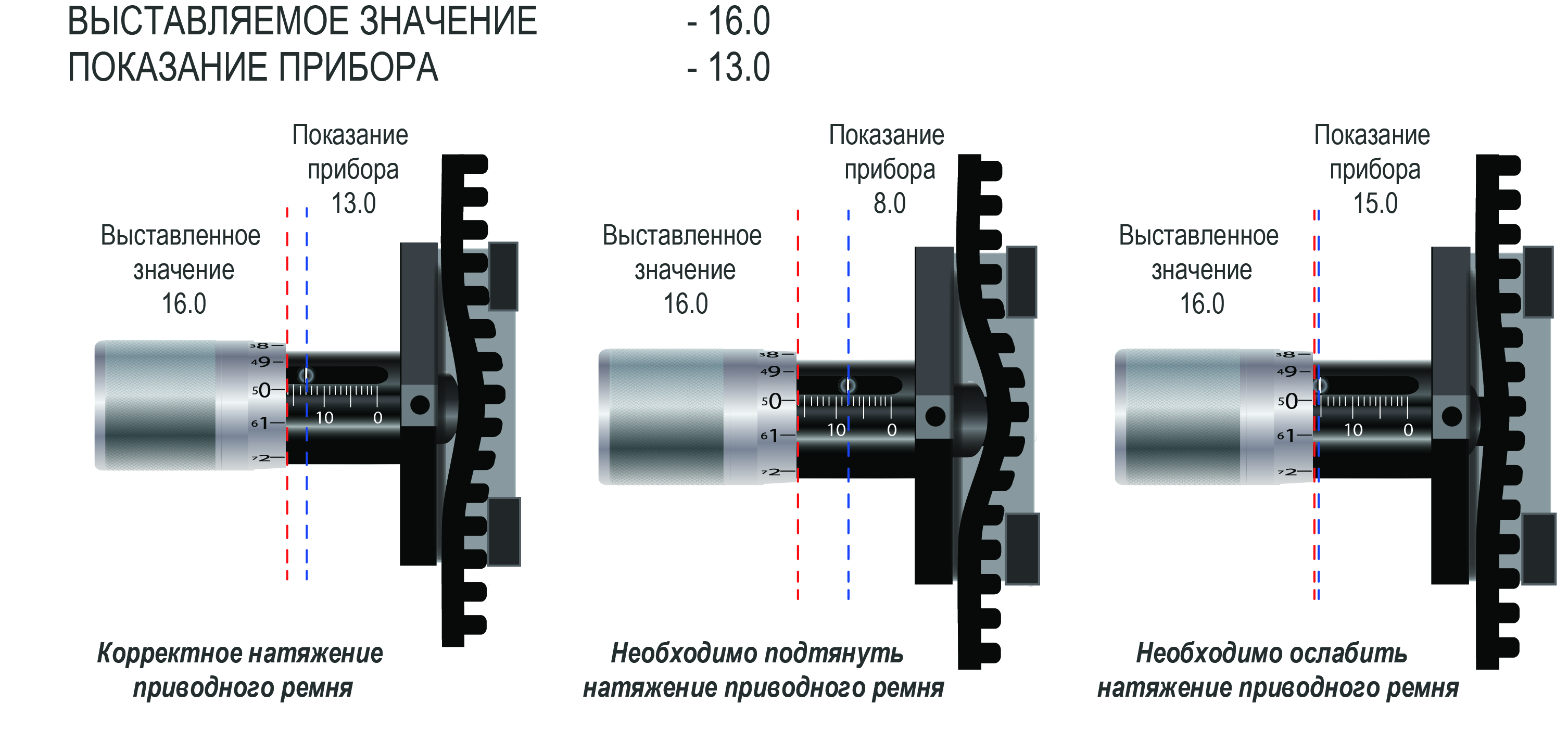 Применение данного изделия позволяет определить качественное состояние ремня и степень его натяжения. Новый ремень имеет большее предварительное натяжение, при этом измеряется либо прогиб (стрелу) ремня под известной нагрузкой, либо нагрузку, которую нужно приложить для получения заданного прогиба. Один оборот рукоятки, 360° соответствует величине перемещения толкателя 1 мм, что соответствует 10N.